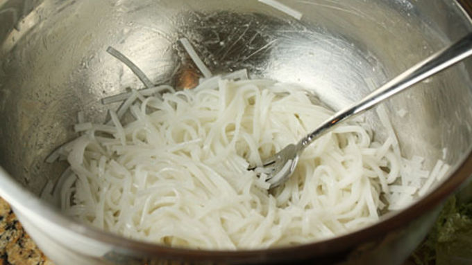 Step3To cook rice noodles, break noodles in half and add to a bowl, cover noodles with boiling water and let sit until noodles are soft, about 10 minutes. Drain and add 1 tablespoon peanut oil to noodles. Stir to coat and make sure noodles aren't sticking together.