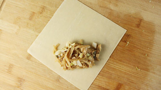 Step11Add a few tablespoons of pad thai filling to end of the wrapper closest to you. It shouldn't be in the center. Leave a good 1/4-1/2 inch of wrapper around the filling.
