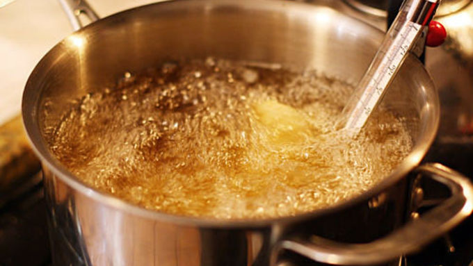 Step15Heat oil to 350°F in a large pot and fry egg rolls in batches until they are nice and brown and crispy, about 5 minutes.