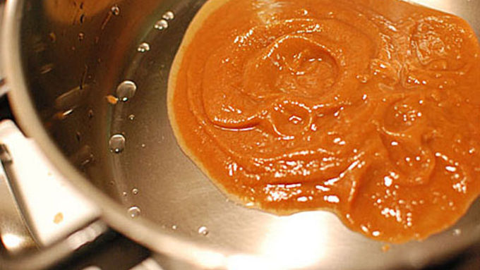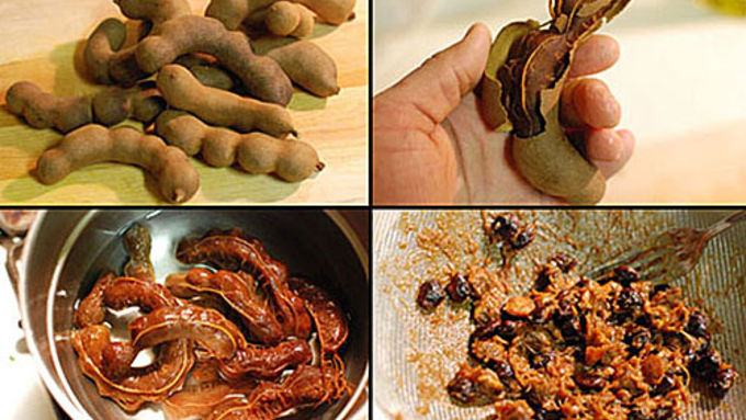 Step1Make tamarind paste. Peel the hard shell off the tamarind pods and place them in a pan with enough water to come about 3/4 of the way up the pods. Simmer this for about 15 minutes until the pods are very soft and the water is brown.