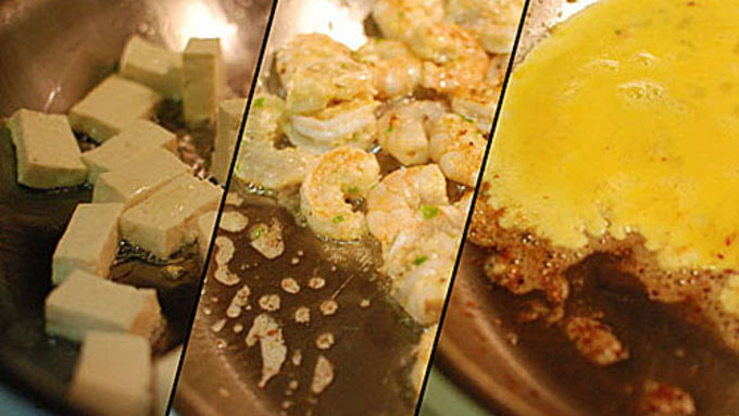 Step7While the risotto cooks, in a frying pan with oil over very high heat, fry the tofu. When it is browned on all sides, remove from pan. Fry the shrimp in that pan for about 2 minutes only and remove. Lastly, cook the egg until scrambled and remove from the pan.