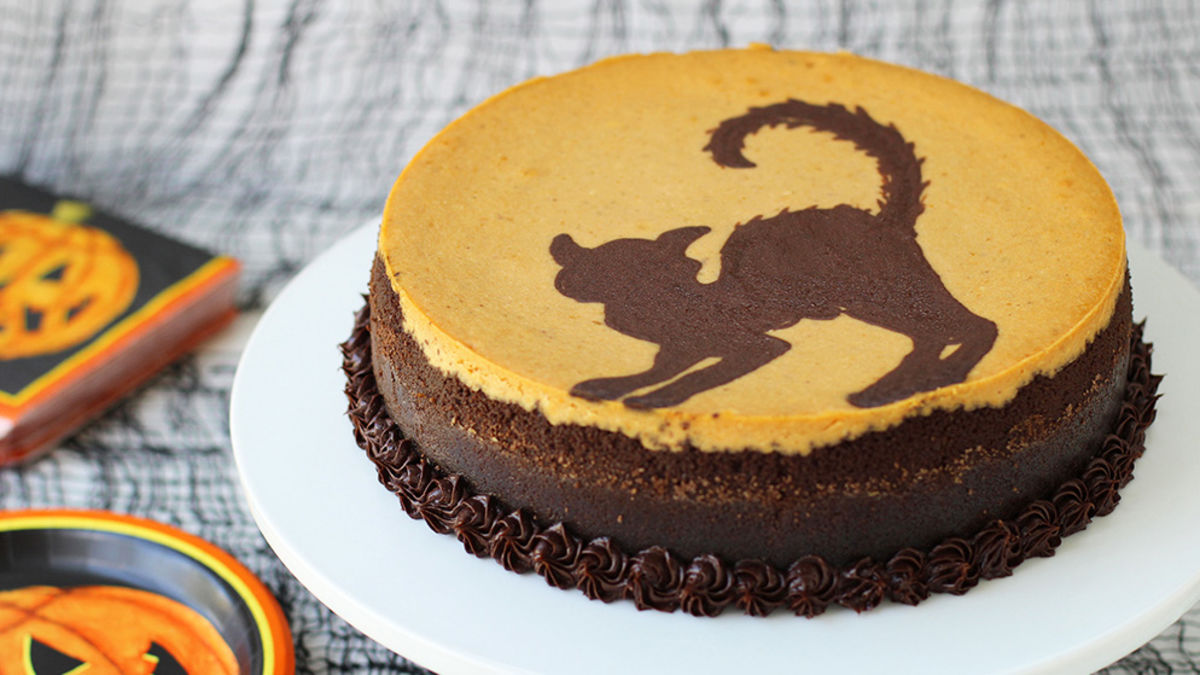 - It's easy to draw your own cute or scary cheesecake designs – all you need is a little imagination! Halloween is my absolute favorite holiday. I remember all the fun I had as a kid getting dressed up in my costume and running through the neighborhood collecting free candy. Every year we host an elaborate Halloween party and I'm always looking to create exciting new desserts. Recently I discovered how easy it is to paint on cheesecakes. By just reserving a small amount of the cheesecake filling you can color it and pipe it on top before it goes in the oven. The design bakes right into the top of the cake and looks really striking! This is such a simple technique – all it requires is a small amount of artistic ability. I'm not one of those people who can just draw something from my imagination (I need to cheat a bit) so I use free clip art or coloring pages to use as a guide. I keep my designs really simple, but if you are a talented artist, the sky is the limit. I chose a simple black cat silhouette for this pumpkin cheesecake, but you could paint black bats flying over the moon or create an elaborate haunted house. Be creative and have some fun! Fall is the perfect time to serve pumpkin cheesecake, so I started out by creating a spiced pumpkin cheesecake filling. The cheesecake has just the right amount of cinnamon, nutmeg, cloves and ginger and a lovely pumpkin flavor. Since I knew I was going to add a black cat I decided to use chocolate graham crackers for my crust. I love the combination of chocolate and pumpkin, but this cheesecake would taste great with a plain graham cracker crust (or even gingersnap).