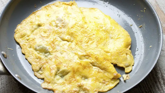 Step3Wipe skillet clean and add a drizzle of neutral oil. Add two eggs to skillet and let cook into a round shape, roughly the size of the pancakes (it doesn’t have to be perfect). Flip eggs so they cook through or cover the skillet to cook the top of the eggs. Slide out cooked eggs and repeat with next two eggs to make 2 round egg discs.