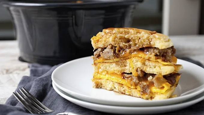 - Ladies and gents, say hello to your new favorite breakfast! I call it the savory and sweet breakfast lasagna because it has everything you want: eggs, cheese, sausage and fluffy pancakes! It might sound a little strange but trust me, it totally works. Especially when you drizzle maple syrup over the whole situation! There are really only a few ingredients to this masterpiece, so let’s tackle each one. The sausage. I like to use breakfast sausage (not spicy) and just cook it in a skillet, breaking it up as it browns. The “noodles” in this breakfast lasagna are pancakes! I just used the standard Bisquick® recipe to whip three large pancakes. Besides the pancakes and sausage, a thin layer of egg ties everything together. Ideally the eggs would be the same shape and size as the pancakes, but don’t worry about perfection. It’ll be delicious even if everything doesn’t match up perfectly. I used a large round casserole dish for my version, but you could just stack everything on a baking sheet if you wanted. Slice it up and serve with maple syrup.