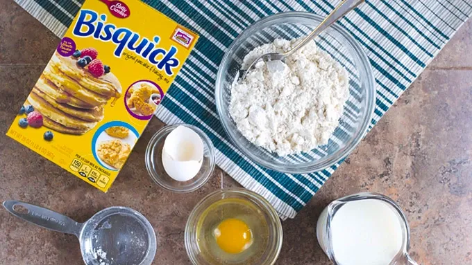 Step2Add the Bisquick to a medium-size mixing bowl. In a small mixing bowl or large measuring cup, whisk together the milk, egg, and canola oil. Add all at once to the Bisquick and stir with a fork, just until combined. The batter will appear lumpy. Gently fold in desired mix-ins.