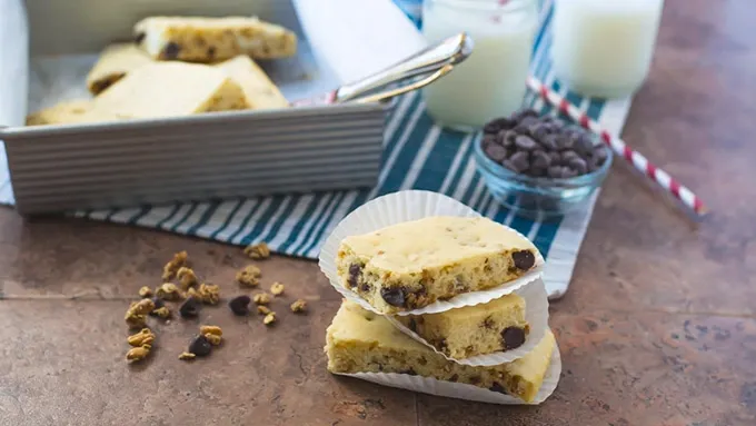 - Easy-to-make bars that you can easily adapt to fit your favorite toppings – and take on the go, too! I snack for the good of humanity. If I don’t eat every few hours, I devolve into a huge grouch. No one deserves to have that kind of misery inflicted upon them! In addition to keeping me full, happy, and healthy, snacks prevent me from unleashing my "hanger" on unsuspecting co-workers. I try to keep a few easy-to-carry, reasonably healthy foods on my person at all times, and these Pancake Breakfast Bars are my latest favorite. Fluffy and filling, these quick and easy bites are endlessly adaptable, portable, and make a totally tasty breakfast or snack on the go. They're are a snap to make, thanks to Bisquick. Gently fold in any of your favorite fruits (dried, fresh, or frozen and thawed all work well), nuts, or chips. I used Cascadian Farms granola to make the bars heartier, along with chocolate chips to make them… wait, do I need a reason for chocolate? Once the bars have cooled, slice them into bars. You can enjoy them immediately for breakfast, freeze them for later, or wrap them up and bring them on the go. When I have time to sit down, I like mine warmed up with Yoplait Vanilla Greek Yogurt for dipping. Whether you're looking for an easy, yummy breakfast, an on-the-go bite, or an after school/work snack, Pancake Breakfast Bars are your man! Er, bar. Just trust me and bake them; you’ll love ‘em.