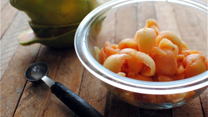 Step1Slice the papayas in half and scoop out the seeds. Discard.