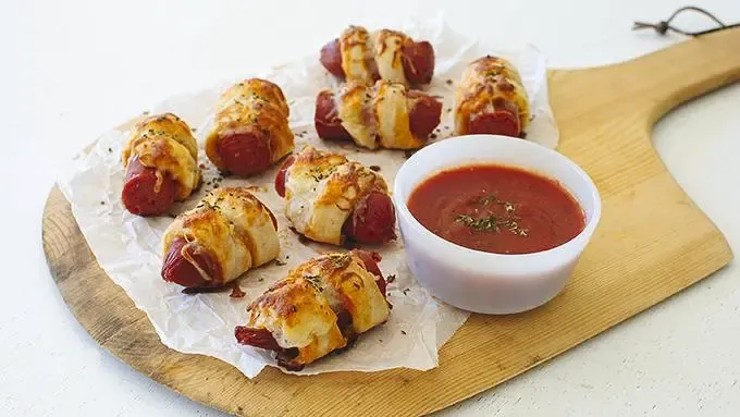 Step2Open pizza dough and slice into 6 even pieces. Slice string cheese down the center and stuff with mini pepperoni.