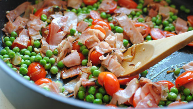 Step3Add the peas and tomatoes and saute until the peas heat through and pop in color, 3 more minutes. Season with a good pinch of salt and pepper.