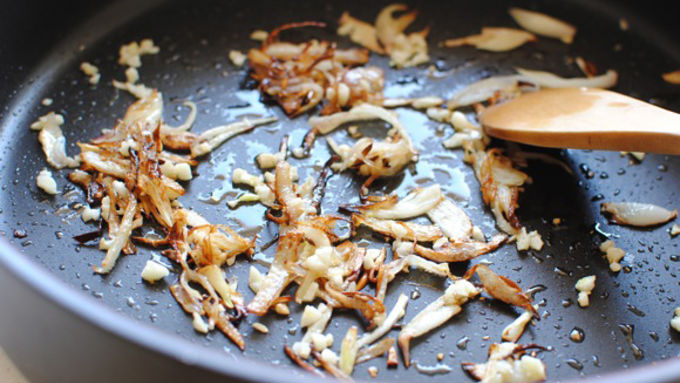 Step1Bring a pot of salted water to a boil. Meanwhile, in a medium skillet, add 2 tablespoons oil and bring to a medium-high heat. Add the shallots and saute they start to brown, 3 minutes. Add the garlic and bloom 30 seconds.