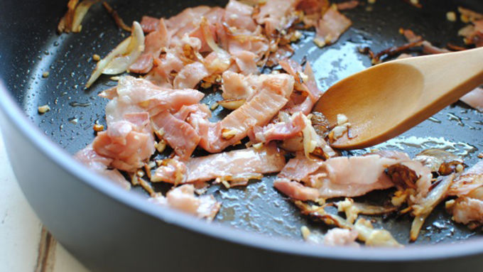 Step2Add the sliced prosciutto and saute until it starts to crisp, 2 minutes.