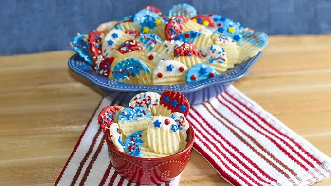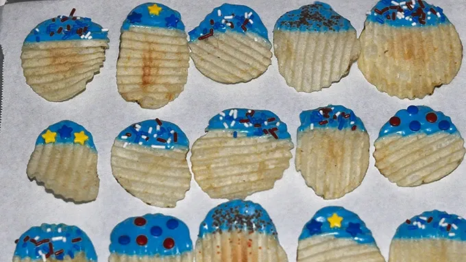 Step4Separate the potato chips into three batches. From the first batch, dip the end of each chip into the melted candy, place onto the parchment-lined baking sheet (making sure the chips do not touch), and repeat. After 5 or 6 chips are dipped, decorate those with patriotic sprinkles while the candy coating is still wet. Repeat with remaining potato chips for that color. Clean the pan and start over with the second and third colors of candy melts until all potato chips are dipped and decorated.