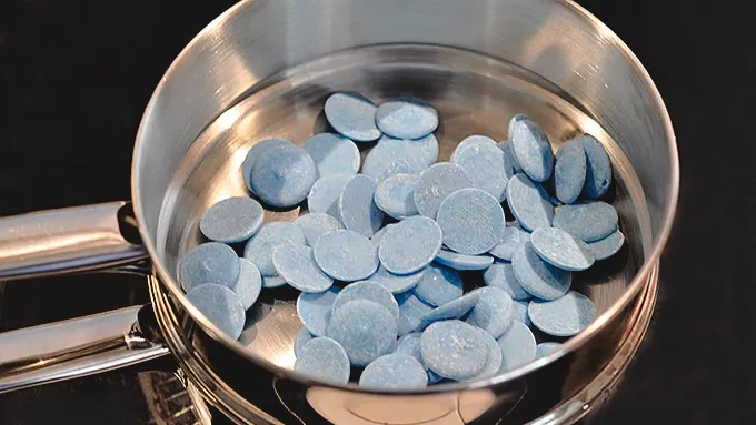 Step2Using a double boiler (or a metal bowl over a small pan), add about an inch of water to the bottom pan and heat to boiling, then remove pan from the heat. Place the second pan over the pan of hot water, then pour the first color of candy melts into the top pan.