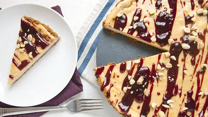 - Peanut butter and jelly find their way into this amazingly tasty and easy cheesecake! I have a confession to make. As a man in his thirties, I still eat peanut butter and jelly sandwiches. I’ll have one for lunch or sometimes (seriously, don’t tell) even for dessert. They're the perfect mix of salty and sweet for me. Folding those flavors into a pretty-looking cheesecake just seemed to make sense, and would be a great dessert for the holidays! To make the crust for the cheesecake, you need two cups of ground cereal or crackers. I used Cinnamon Toast Crunch, but you could also use Peanut Butter Toast Crunch for an extra layer of PB flavor. Just grind up the cereal finely. If you don’t have a food processor, just put the cereal in a bag and roll over it with a rolling pin. If you're using a normal springform pan it can also be a good idea to bake the cheesecake in a water bath, which will keep it moist. There’s no need to do this if you use the tart pan though. Then you can garnish it with a lot of grape jelly and peanuts. To make the grape jelly pourable, just heat it in the microwave in 15 second bursts. Then drizzle away. Now I can have my PB&J cheesecake and eat it too!