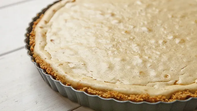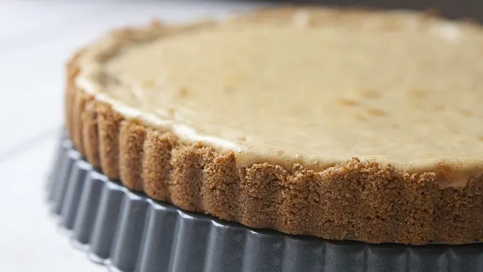 Step3Pour filling into baked crust. Turn oven down to 325°F and bake cheesecake for 50-70 minutes until the filling is just set. If you use a wider pan (like an 11-inch tart pan) the cheesecake will be less deep and need less baking time. A taller cheesecake will need over an hour to set completely.