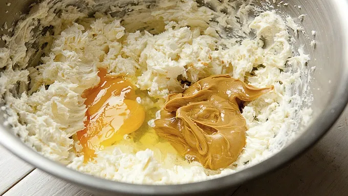 Step2In a medium bowl, beat together cream cheese and sugar until the mixture is smooth. Then add in eggs, one at a time, followed by peanut butter, sour cream and heavy cream. Mix well to combine.