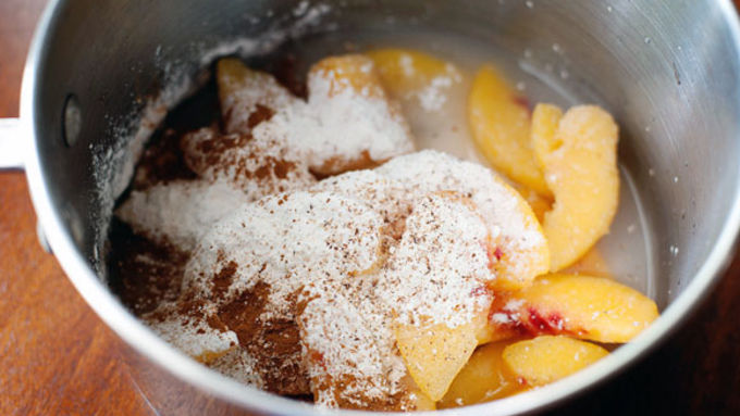 Step1Add peaches, water, sugar, cornstarch, nutmeg, cinnamon, and salt to a saucepan.