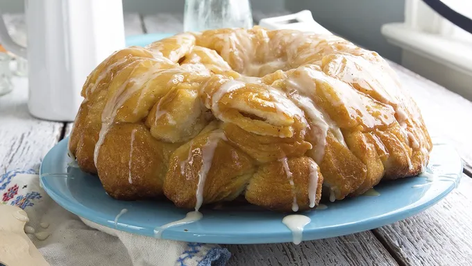 Step4Pour melted butter evenly over biscuits in bundt pan. Bake 30 minutes until center of bread is no longer doughy. Transfer to a cooling rack to cool 10 minutes, then carefully invert bread onto a serving plate. Let cool completely.