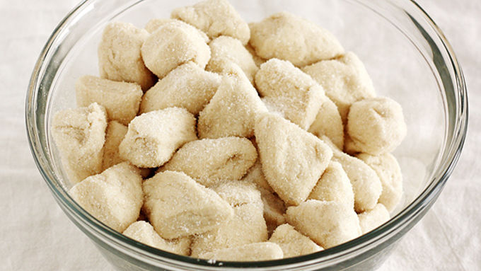 Step2Divide biscuits and cut each biscuit into quarters. In a large bowl, toss biscuits with sugar until well coated.