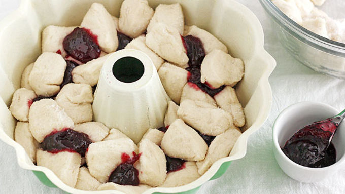 Step3Place a layer of biscuits in bottom of prepared bundt pan. Top with a few teaspoonfuls of grape jelly. Top with another few pieces of biscuits, then top with remaining jelly (in teaspoonfuls). Top with remaining biscuits.