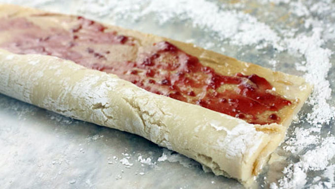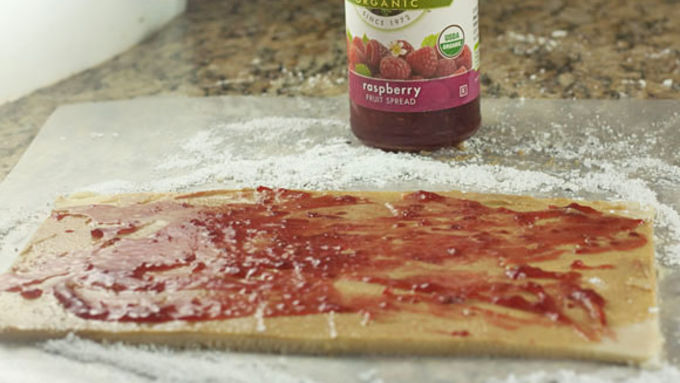 Step6Spread 1/4 cup of creamy peanut butter on surface of dough followed by 1/4 cup of jelly.