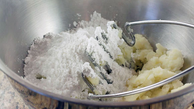 Step3Add potatoes to a medium bowl and mash well. Add powdered sugar to potatoes and continue mashing.