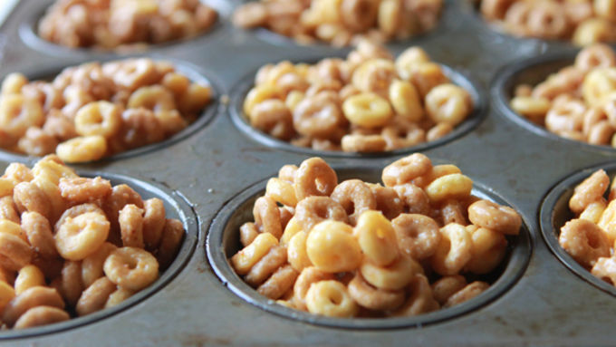 Step2Press the Cheerio™ mixture into a muffin tin sprayed with nonstick cooking spray. Press each cup of Cheerioes™ down firmly, so they are well-packed together, then allow them to cool completely, about 15 minutes. (You can place them in the fridge to speed up this process, if needed!)