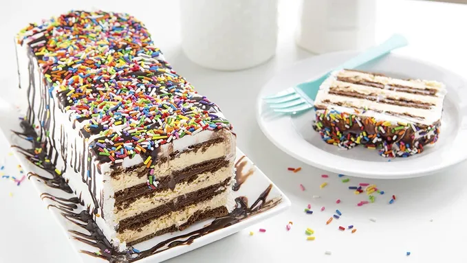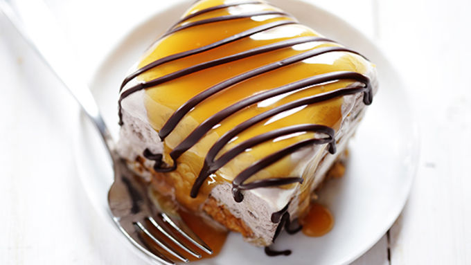 - Growing up, I used to love making icebox cakes in the summer with my mom. We would mix and match crusts and cookies, creams and yogurts, and have so much fun seeing what new creation we would enjoy for dessert! The main thing she taught me is that icebox cakes are nearly impossible to mess up. If you have the ingredients for a crust, and then layer in some whipped cream for the filling, the sky’s the limit with anything else you want to throw in! So I decided to throw in three favorites with this cake – some peanut butter squares, chocolate whipped cream, and some salted caramel. De-ca-DENT. And surprisingly easy. Freeze until frozen though, at least two hours. Remove from freezer and cut into squares to serve. Then drizzle with remaining caramel sauce, a little chocolate sauce, then sprinkle with sea salt. Even as it starts to melt, it still tastes PB-caramel-chocolate-tastic.