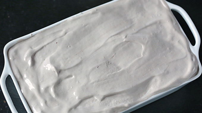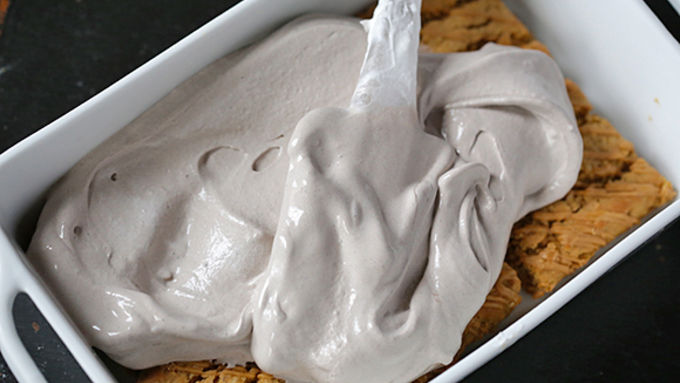 Step3Spoon half of the chocolate whipped cream onto the peanut butter square layer, then use a spoon to even the surface.