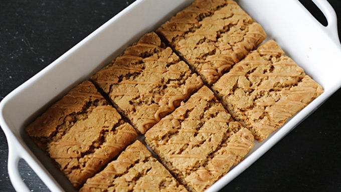 Step1In a bread pan, layer 6 peanut butter squares so that they are touching side-to-side.