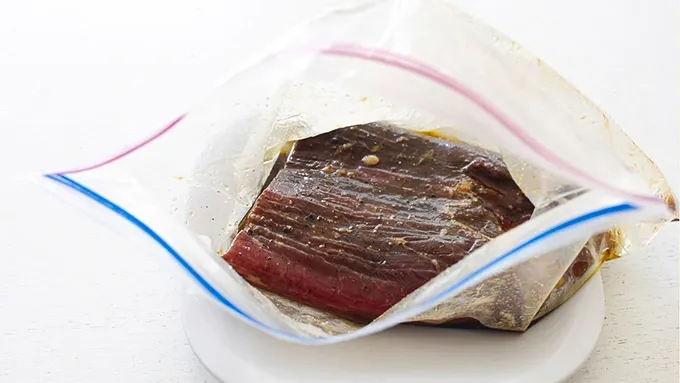 Step1Pierce the steak all over with a fork and place in a large sealable plastic bag. Add the olive oil, 3 tablespoons soy sauce, garlic salt, and a pinch of salt and pepper. Seal bag and marinate steak for an hour, and up to overnight.