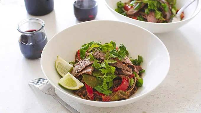 Step5Thinly slice the steak and serve on top of a small mound of noodles and vegetables. Garnish with scallions and cilantro leaves. Garnish with chopped peanuts, if desired. Serve immediately.