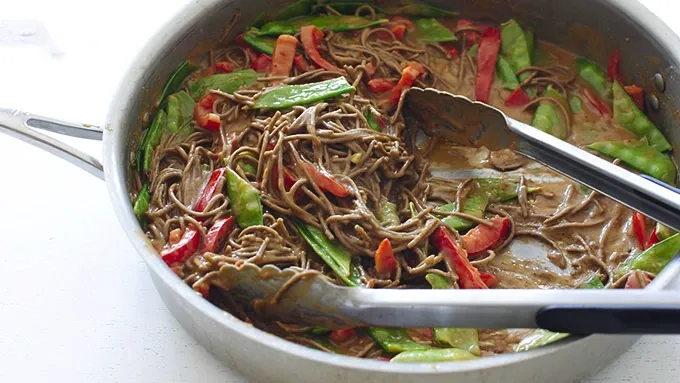 Step4Add the soba noodles, snow peas and red bell pepper and continue to stir until the soba noodles have softened, 5-8 minutes.