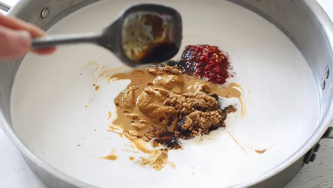Step3In a large sauté pan, add the coconut milk, peanut butter, brown sugar, sambal oelek, lime juice, fish sauce, the remaining 3 tablespoons soy sauce and stock. Whisk over a medium heat until it starts to lightly bubble.