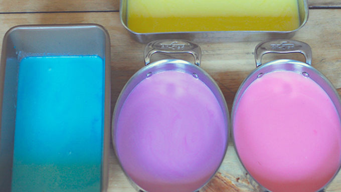 Step4Pour 1 cup of the mixture into each pan. Using food coloring, add enough to achieve the desired color. For the pastel pink, I used 2 drops of neon pink food coloring. For the lavender, use 2 drops of neon purple food coloring. For the blue, use 2 drops neon blue food coloring. For the yellow, use regular yellow food coloring (about 6 drops). Stir to thoroughly dye each pan. Refrigerate for at least 4 hours or overnight.