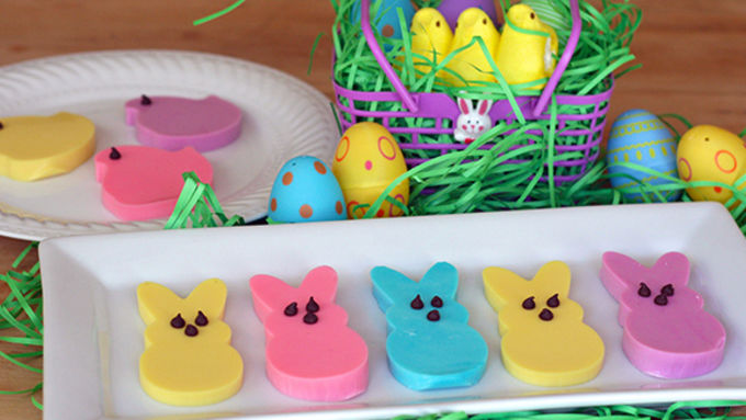 - "Peep" these cute marshmallow flavored jelly shots shaped like the classic Easter treat. Nothing says “Easter” like marshmallow Peeps. And nothing says “Easter for Adults” like marshmallow-flavored Peeps jelly shots! (Hey, who says the kids get to have all the fun?} To make these, you'll need a set of these Wilton Peeps cookie cutters. If you can't find these in stores, you can always try finding some online. You'll also need four small pans, one for each color (pink, lavender, blue, yellow). I used a combination of a loaf pan, small breading pans (slightly larger than half of a square baker), and small oval bakers. To ensure you have a small enough pan, pour a cup of water in and make sure the shots will be thick enough (roughly half an inch). You'll love these Easter chicks and bunnies with a boozy twist! Happy Easter!!