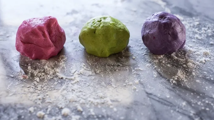 Step2Generously flour your work surface. Divide the sugar cookie dough into thirds. Working with one piece of dough at a time, knead 1-2 drops of food coloring into the dough until smooth. Repeat with the remaining dough, but use a different color for each 1/3 of dough. You should end up with three different colored balls of dough.