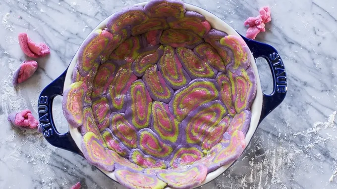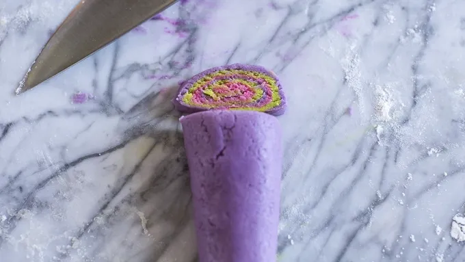Step3Lightly flour your work surface once more and roll each round of dough out into roughly a 9x6 inch rectangle. Carefully stack each sheet of dough on top of each other. Gently press down on the top to adhere the sheets of dough together. Roll up tightly into a layered log and slice into 1/2-inch rounds, as you would with slice-and-bake cookies.