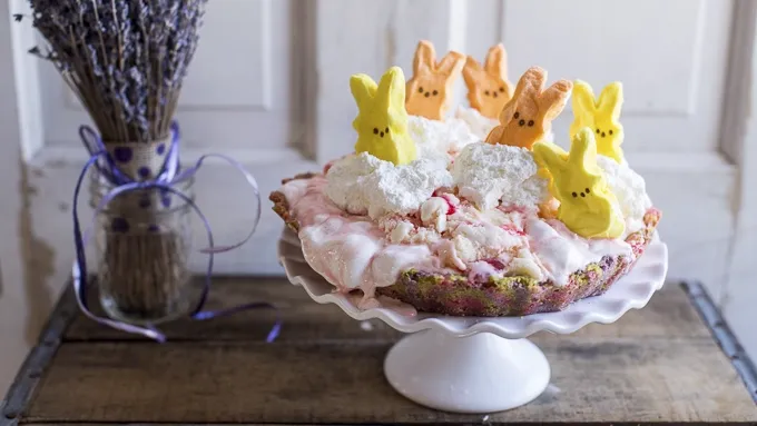 - Perfect for Easter or any spring event, this dessert is dressed to impress. Can you believe that spring is almost here? I know a lot of you have had a pretty rough go this winter, especially the eastern half of the country, but I’ve got a colorful pie to kick out those winter blues and get your spring started on the bright side! Growing up, my mom used to put Peeps™ in our Easter baskets. For me, it’s just not Easter without Peeps™. I love their pastel colors. They make me happy just looking at them. Kind of like the way flowers make me happy, but with Peeps™ I get a sugar high too! Awesome. This all leads me to THIS incredible pie. It’s all things Spring and Easter – but in a pie full of color and sweetness. And the crust? Oh my gosh, it’s made with sugar cookie dough! Even better, I colored the dough and rolled it up cinnamon-roll style to make this uniquely delicious base that's filled to the brim with strawberry ice cream and marshmallow fluff. It's just TOO good!