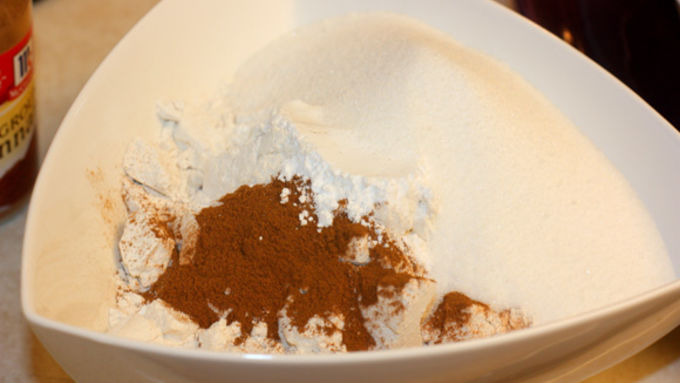 Step2In a mixing bowl, stir together flour, sugar, baking powder, baking soda, and ground cinnamon. Set aside.