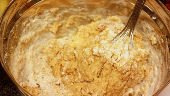 Step4Stir applesauce mixture into flour mixture until just blended.