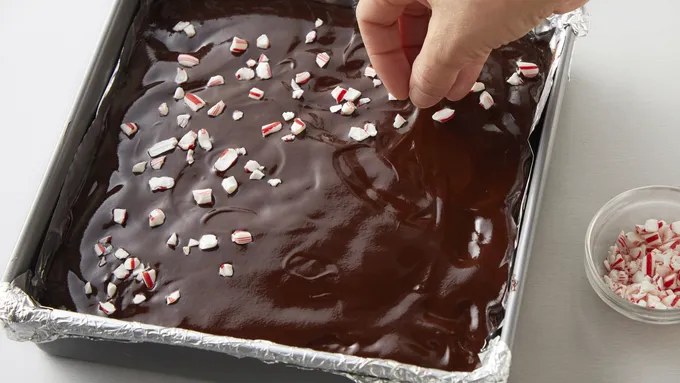 Step5Spread evenly over cooled brownies. Immediately sprinkle crushed candy canes on top.