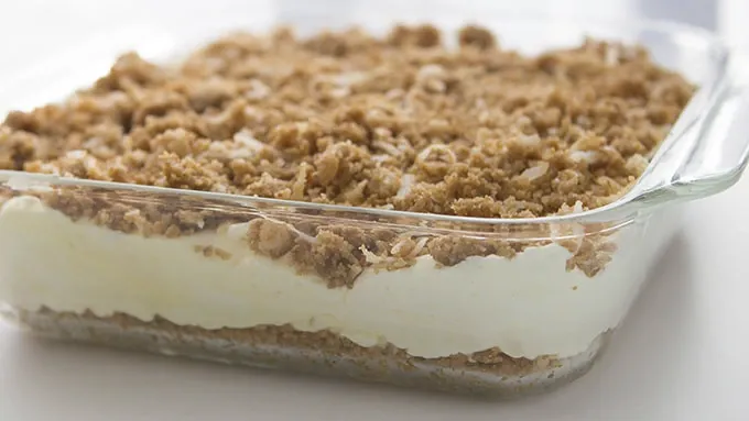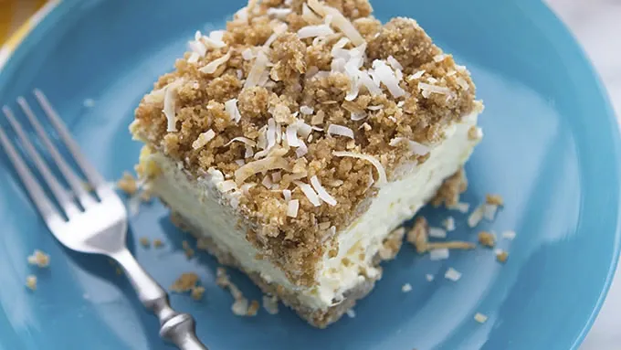 Toasted coconut is mixed into a crunchy, buttery granola bar streusel, then sandwiched around a creamy coconut-pineapple filling.