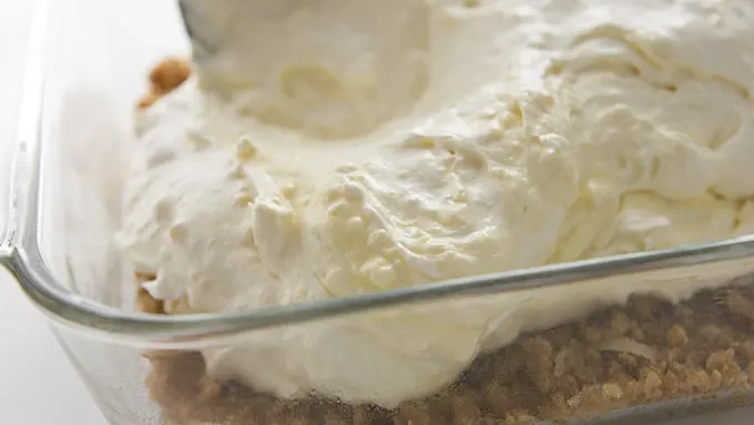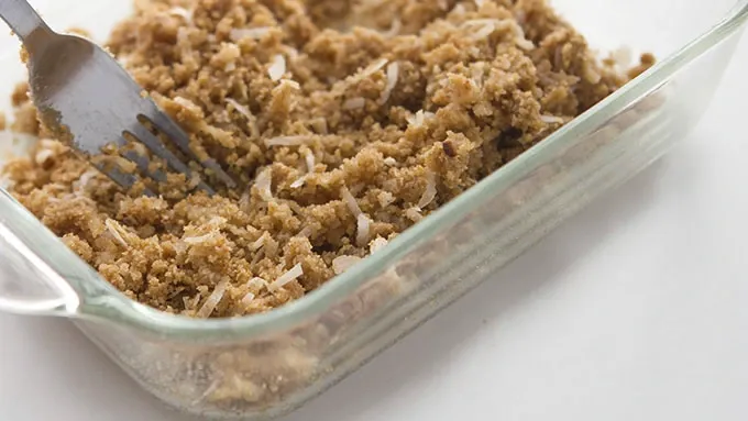 In a large bowl, stir together crushed granola bars, toasted coconut, melted butter and sugar until well mixed. Press half of the mixture into a 9x9-inch baking pan that has been generously sprayed with nonstick spray.