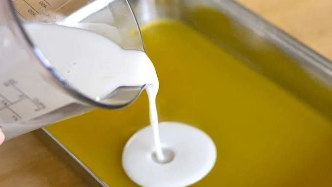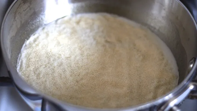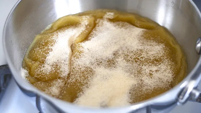 Step3Pour coconut cream into a small saucepan and sprinkle with 1 envelope of unflavored gelatin and allow to soak in a minute or two (you may need to warm the cream in the microwave for a few seconds before sprinkling with gelatin if it's in a solid state). Heat over low to medium heat and stir in sugar. Continue stirring and heating until gelatin and sugar has dissolved. Remove from heat and cool.