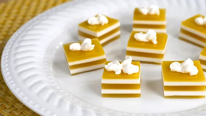 - Coconut lovers will definitely want these shots, made with real pineapple juice, white rum, and coconut cream! If you like pina coladas and getting caught in the rain, then you’re going to love these jelly shots. (P.S. I’ve been humming that song all day long. It’s probably stuck in your head now too. You’re welcome.) OK, so you’ll need a small pan to make these beautiful layered shots. I love to use my 6x9-inch breading pans for jelly shots because they're the perfect size. If you don’t have one, you can try a loaf pan. If you have to use a brownie pan or something similar, you’ll need to increase the amounts. Note: If you can't find coconut cream, simply buy a can of regular coconut milk – but NOT the light stuff. And instead of shaking to combine, just spoon the cream off the top. It will likely be in solid form, so you'll need to heat it for a few seconds to get it to liquefy. Once you're ready to serve, gently pull the edges away from the sides of the pan. Carefully invert onto a cutting board and slice into even squares. The sharper and skinnier the knife, the better! I like to use my boning knife because I so rarely use it. If desired, top with a dollop of whipped cream (because everything is better with whipped cream!) and serve.