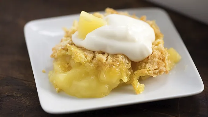- The tropical flavors of a pina colada and the ease of a dump cake make for a delicious dessert! I’m a big fan of pina coladas. I mean, who isn’t? You should know that I’m seriously resisting the urge to sing about pina coladas right now. You’re welcome. I’m also a big fan of cakes. Especially dump cakes! They’re not always the prettiest, but they’re just about always the easiest. I went ahead and married pina coladas with dump cake, and you’re going to love it. I left out the booze, but feel free to serve this with a shot of rum to wash things down. I won’t tell anyone. You could top it with whipped cream, but why would you do that when you can double down with Yoplait’s pina colada yogurt?