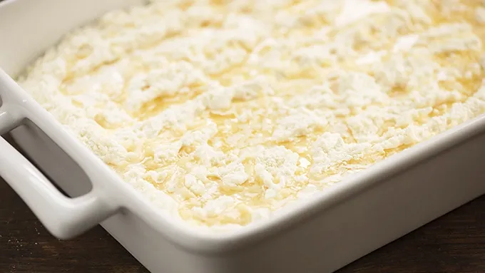 Step3Melt the butter and drizzle over the cake mix, being careful to cover as much of the cake mix with butter as possible.