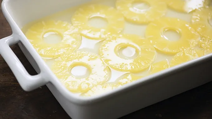Step1Preheat oven to 350°F. Drain the pineapple rings and reserve the liquid. Arrange the pineapple rings in a single layer in a 9x13-inch baking dish. Pour the liquid from the can over the rings.