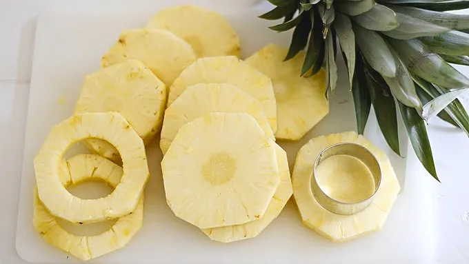 You can either slice a pineapple into rounds and core the centers using a biscuit or cookie cutter, or you can also use canned pineapple rings.